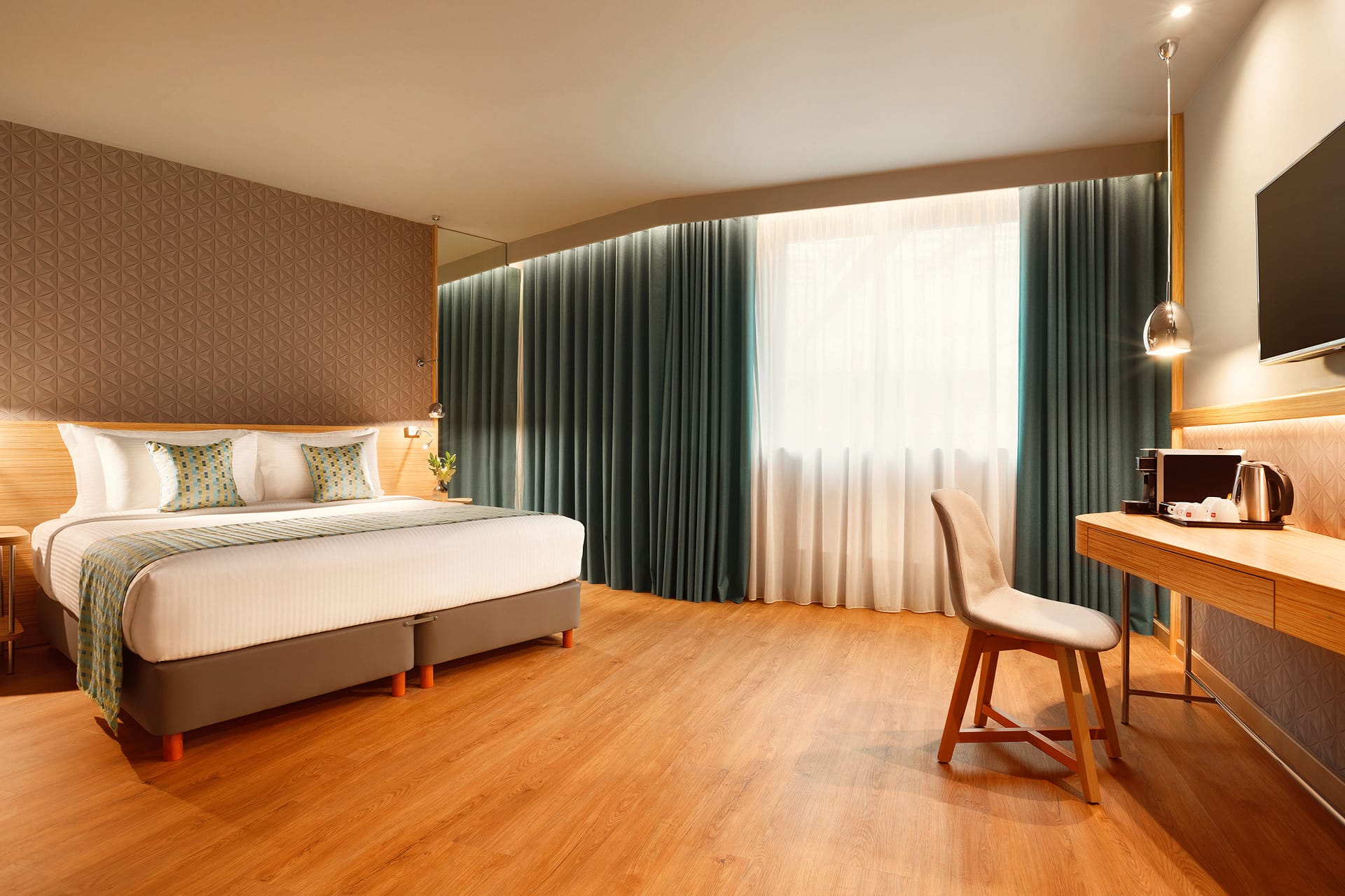 Luxury and comfort come standard in every room at Wyndham Grand Athens. The Standard Double Atrium View room features a king-sized bed, a functional working desk with Espresso machine and a spacious bathroom with luxurious bathroom amenities. Pillowtop mattresses and Egyptian cotton linens offer a comfortable, good night’s sleep and a free Super-Fast Wi-Fi keeps you connected. Select your favorite TV Satellite Channel in the LED LCD TV 43’’while enjoying our in-room special dining options. The window offers natural daylight from the hotel atrium and view to FOS Restaurant on the ground floor.