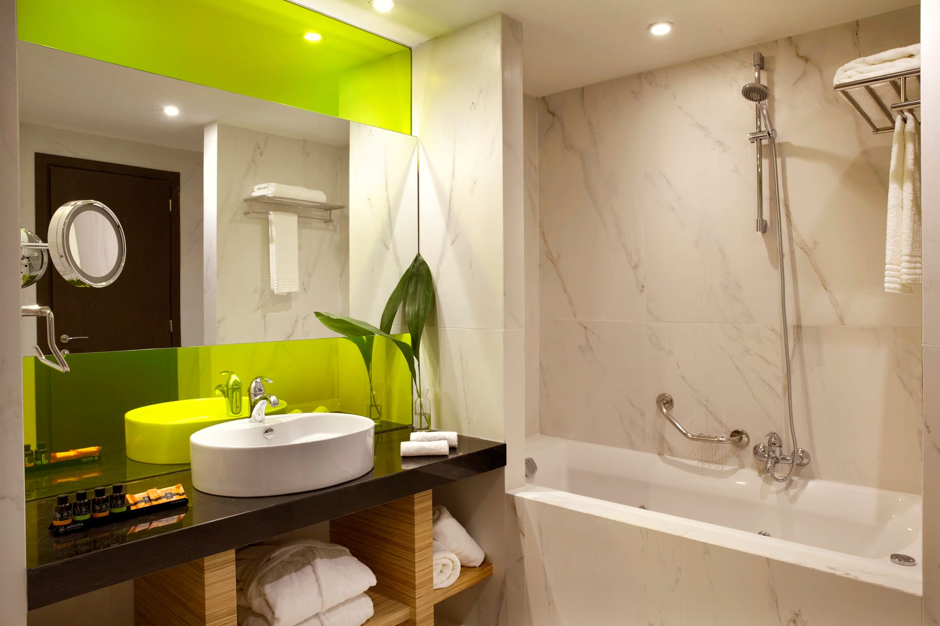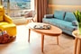 In the Executive Suite with Acropolis view our guests enjoy a wealth of amenities along with unobstructed views of historic Acropolis. The bedroom has a mix of luxury and casual atmosphere with a king-sized bed, a working desk and spacious closets. The living room is a separated area with a comfortable sofa bed, an easy chair with ottoman and a modern floor lamp. Both rooms have a LED LCD TV 43’’, modern furniture, warm colors in floors, fabrics & modern wallpapers and indirect lighting for a relaxing atmosphere. Other amenities & services include an Espresso machine, tea & coffee facilities, iron & ironing board & pillow selection, luxurious branded bathroom amenities and Free Super-Speed Wi-Fi connection. Luxury marble ceramic tiles and tinted mirrors make the bathrooms playfully luxurious and yet chic while they offer bathtub, shower and two washbasins. Pamper yourself by selecting our in-room private dining options with direct view to the lit Acropolis or Lycabettus hill or book a rejuvenating massage treatment in the comfort of your suite. The executive suite is ideal also for families for a shopping weekend and we also offer kids in-room dining options.