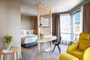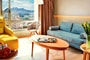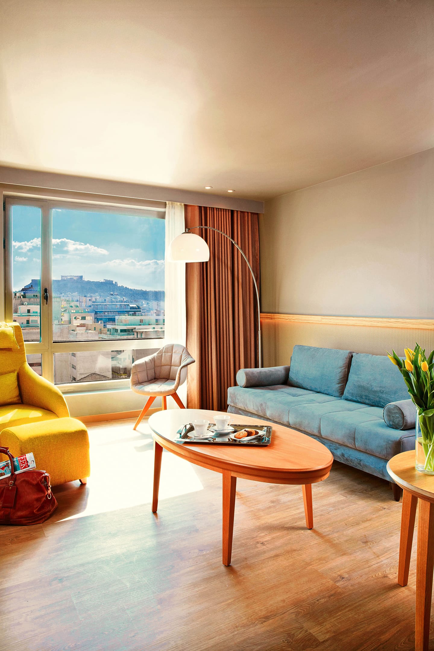 Grace and elegance go hand-in-hand in our Junior Suite with breathtaking Acropolis view. Designed and furnished for maximum comfort, this Junior Suite offers kind-sized bed with pillowtop mattresses, Egyptian cotton linen sheets for a relaxing sleep. The spacious living room is separated from bed area with a wooden carved partition which has in both sides two LED LCD TV 43’’ for undisturbed watching from bed but also from the living room. A comfortable working desk lets you catch up with your work while our Super-Fast Wi-Fi keeps you connected at all times. The living room with view to the Acropolis is the best place to relax or read with a comfortable sofa bed, an easy chair with ottoman and a modern floor lamp. Other amenities in the suite are an Espresso machine, coffee & tea facilities, pillow selection, iron & ironing board and branded bathroom amenities for adults and for kids. The bathroom has shower, bathtub and two washbasins with playful mirrors.