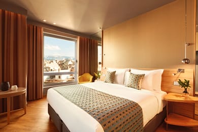 With views of the city that can’t be beat, you won’t find a Junior Suite in Athens that offers the same affordable luxury and refined atmosphere as our own Junior Suite with city view. The kind-sized bed comes with pillowtop mattresses and Egyptian cotton linen sheets for a relaxing sleep. Α wooden carved partition separates the bedroom with the living room and has double use as a working desk on one side with tea & coffee facilities and an Espresso machine and two LED LCD TV 43’’ on both sides in order to be able to watch from bed but also from living room. The living room offers a comfortable sofa bed and easy chair with ottoman and has distinctive lighting. The spacious bathroom with colored mirrors and transparencies, offers shower and bathtub and luxurious branded amenities for adults and for kids. Free Super-Fast Wi-Fi keeps you connected at all times while you are enjoying the view of the city from the perimetric windows of the room.